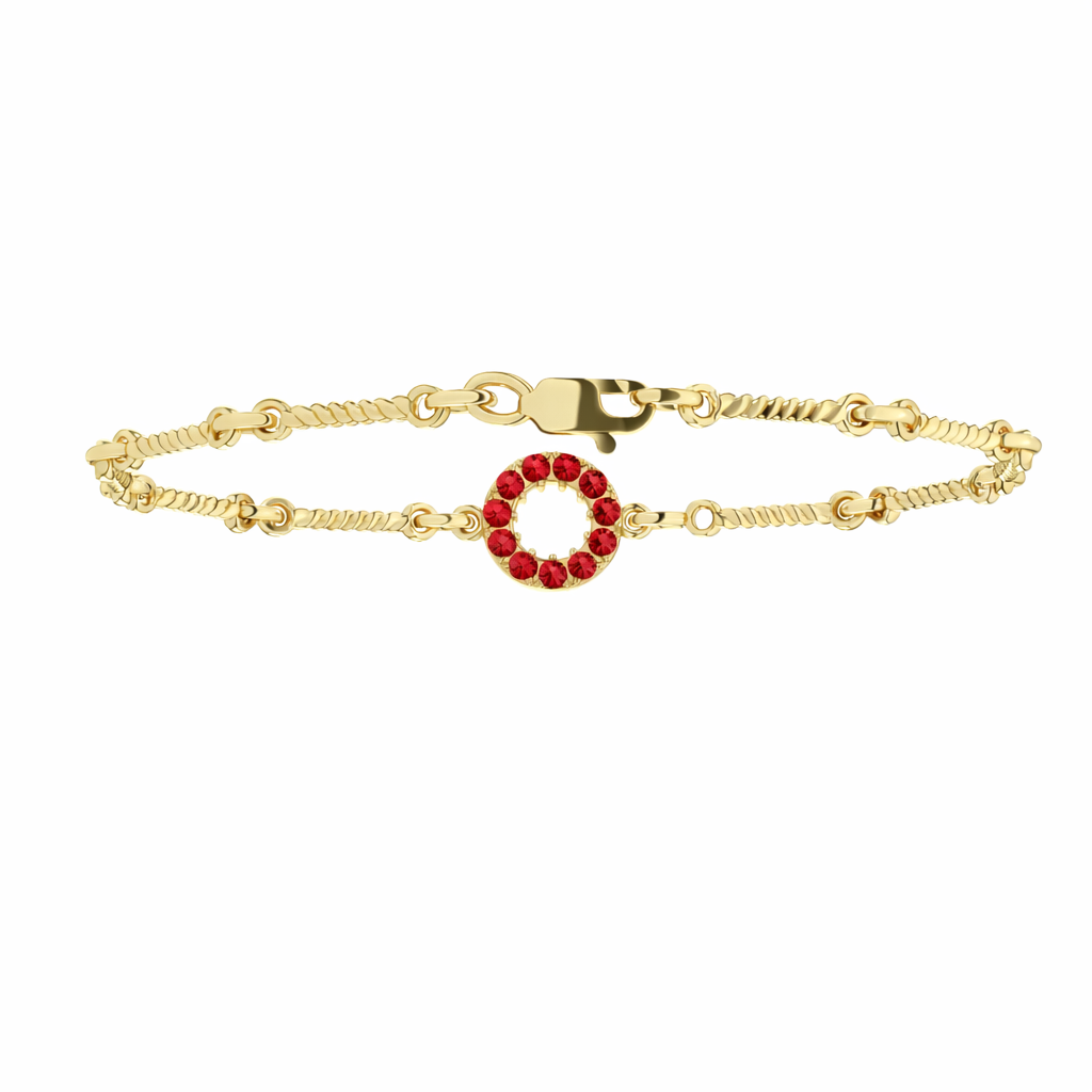 Ova elegantna narukvica izrađena od žutog zlata odiše sofisticiranošću i suptilnim luksuzom. U njenom centru je okretni kružni detalj koji s jedne strane sija zahvaljujući briljantski sečenim laboratorijskim dijamantima, dok druga strana otkriva nežno crvene tonove topaza. Precizno izrađena, sa pažljivo oblikovanim lančićem i savršenom ravnotežom boja i sjaja, ova narukvica je idealan dodatak svakodnevnom stilu ili kao poklon sa dubljim značenjem i mogućnošću personalizacije nošenja.